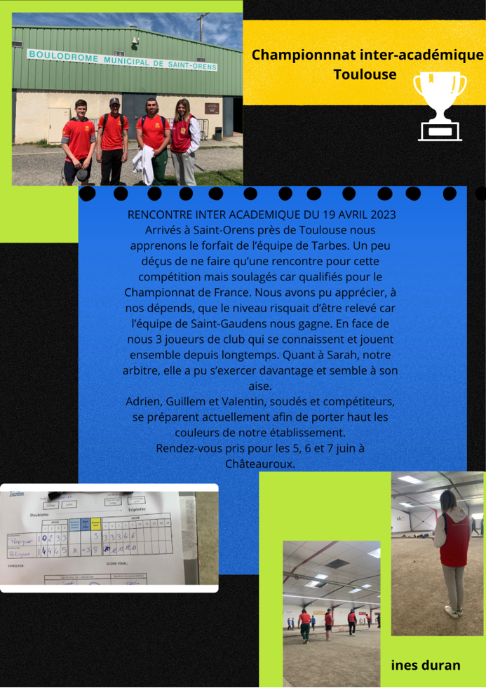 L'équipe AS pétanque du lycée Pablo Picasso a participé au championnat inter-académique le 19 avril 2023 à Saint-Orens, près de Toulouse.