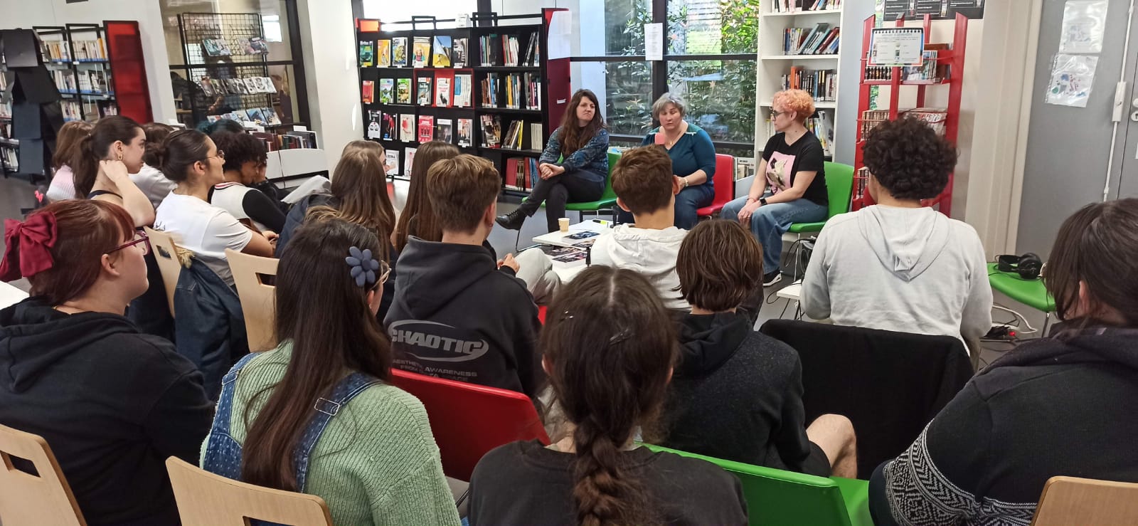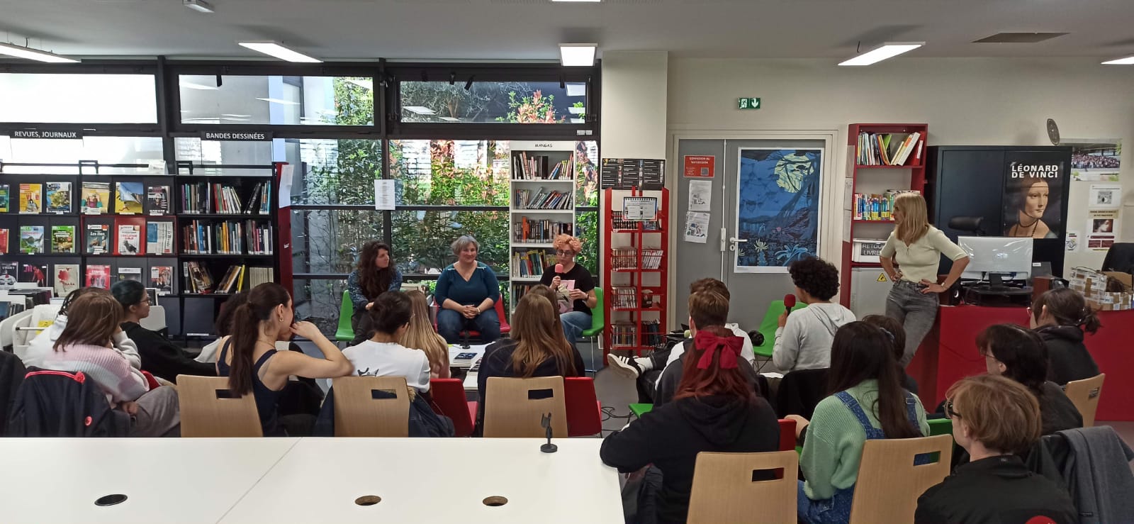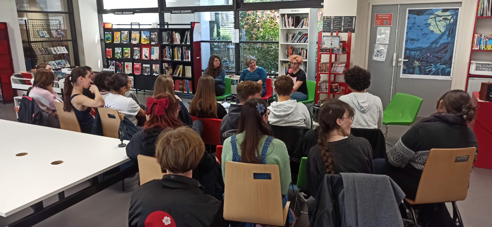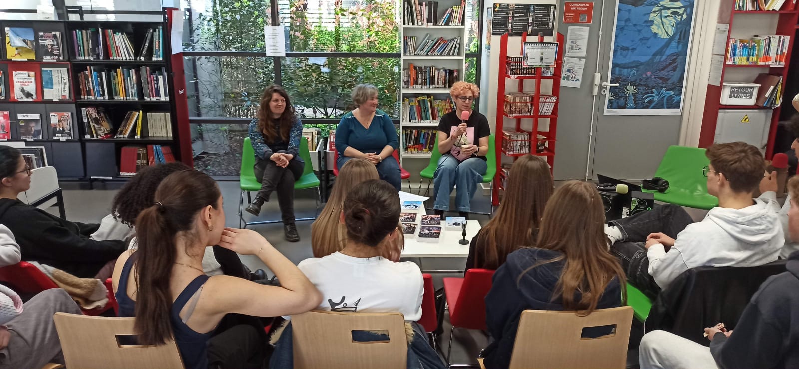 Les élèves du lycée volontaires (une vingtaine) ont pu échanger avec Cécile Vicka, romancière, autrice de romances, et Ombelline Genis, libraire à Perpignan.