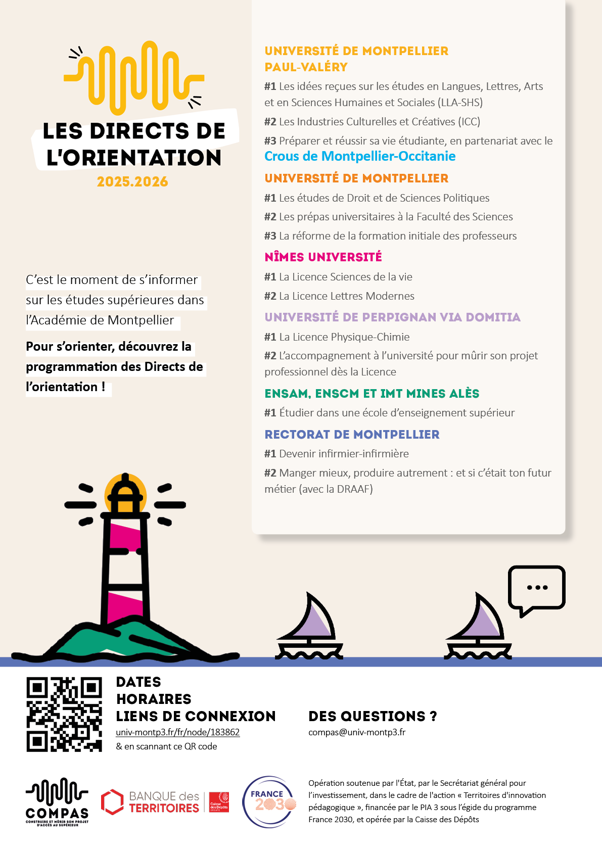 Vous souhaitez en savoir plus sur les formations de l’enseignement supérieur dans l’Académie de Montpellier ? Les établissements partenaires de COMPAS proposent une programmation de 15 Directs de l’orientation tout au long de l’année.